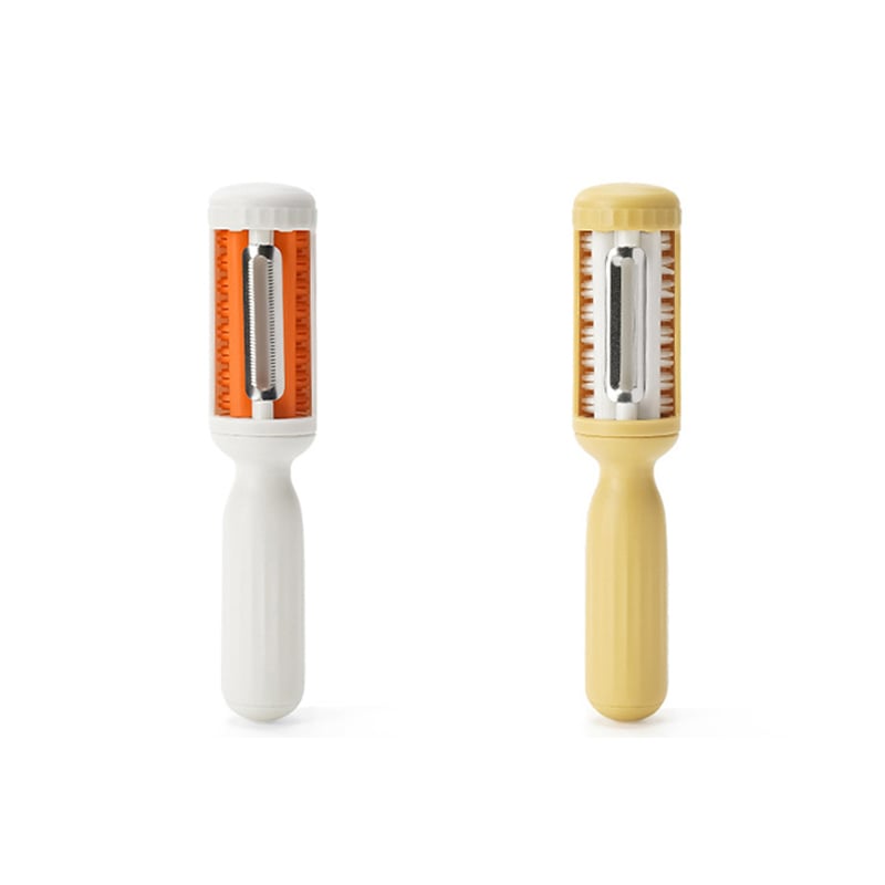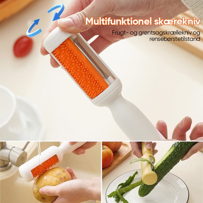 To i ét design. Denne moderne design frugt- og grøntsagskræller kommer med to-i-én-skrællerblade til alle dine frugt- og grøntsagskrællere, så du ikke behøver at købe to forskellige skrællere. Brug begge sider på samme tid til at skrælle forskellige slags frugter og grøntsager og tøm den, når den er fuld.