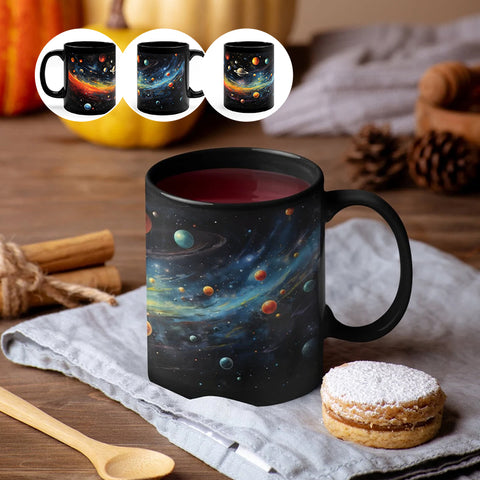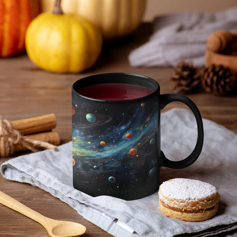 Kosmisk kaffee med er et unikt designet kaffekrus dekoreret med et kosmisk mønster, der giver det en mystisk og fascinerende følelse.